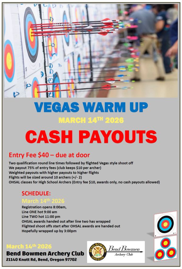 Check our website (Calendar) and Facebook and Instagram (Bend Bowmen Archery Club) to stay up to date with the club schedule.