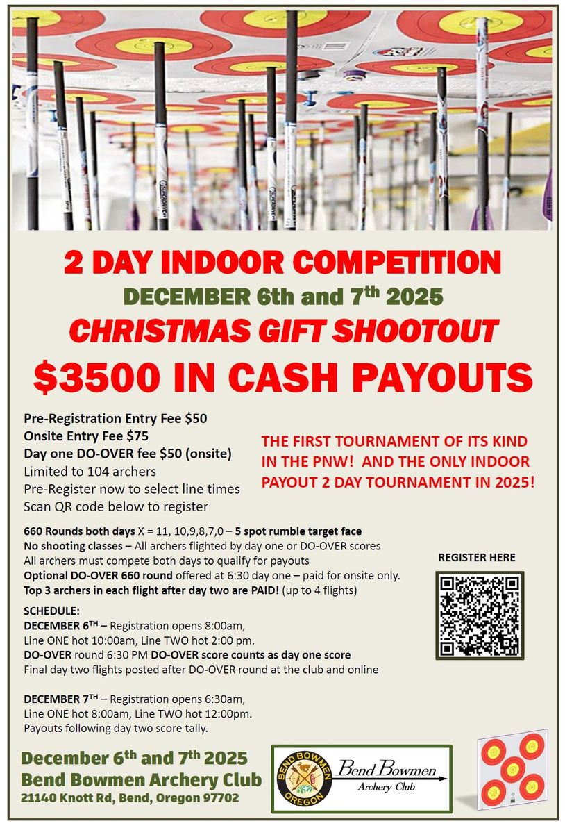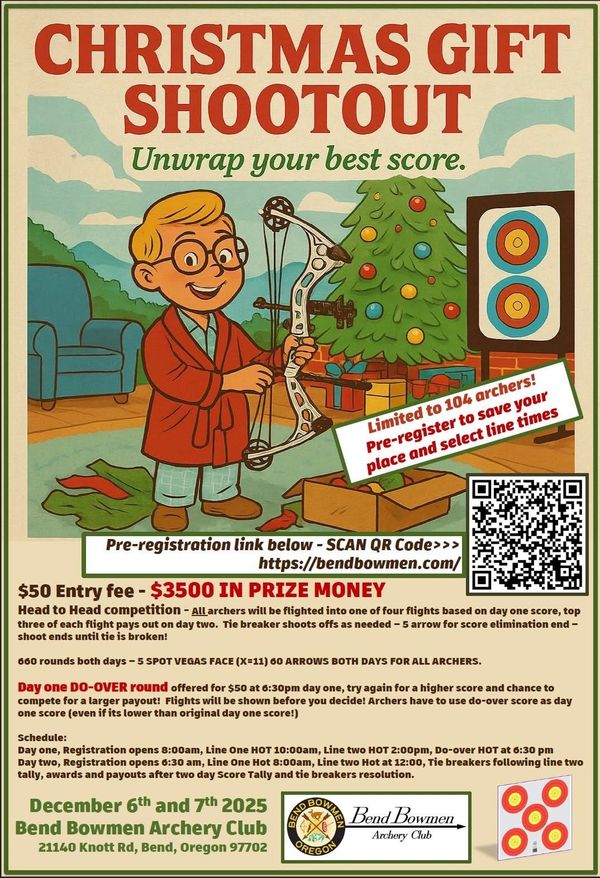 The Christmas Gift Shootout is coming December 6,7 2025 — drawing archers from Oregon, California, Washington, and Idaho. This premier tournament includes flighted competition divisions with cash prizes, and we need your support. Your donation not only helps to fund the tournament — it also supports the Bend High Archers, ensuring that youth athletes have opportunities, coaching, and equipment to keep our archery community strong.
